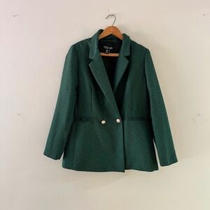 Classic blazer with 2 button closure and structured styling. rear vent still sewn shut/in like new used condition! Size medium with approximate measurements laying flat of 19" chest and 28" length. From a smoke-free, dog friendly home.
