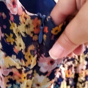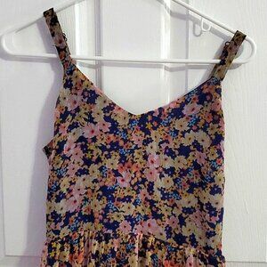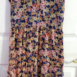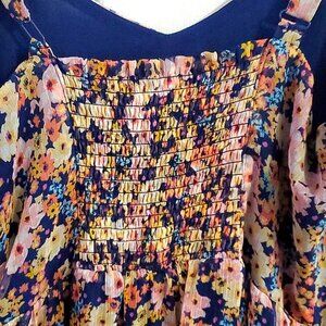 Beautiful pastel colors floral tiered maxi dress with blue lining. V-neckline. Adjustable straps. Smocking on the back. Shell and lining are 100% polyester.