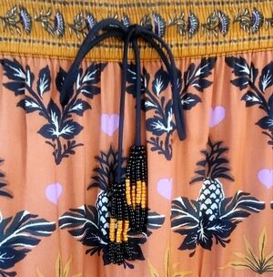 Rachel Zoe boho maxi skirt in small. Beautiful salmon or terra cotta shade with black & white botanical print and lavendar hearts. Beaded drawstring tie. Full skirt has 3 tiers.