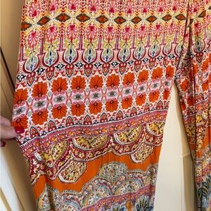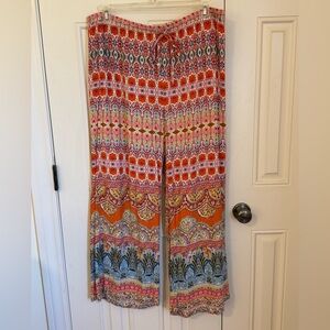 Colorful wide-leg pants with intricate patterns. Perfect for casual outings. Comfortable and stylish.