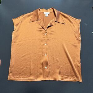 Rachel Zoe Brown Metallic Sleeveless Button Up Blouse Shiny Relax Fit Boxy Top