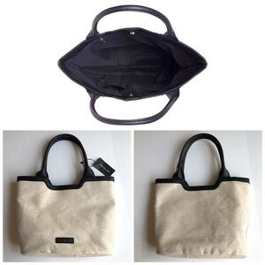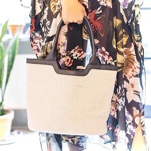 Rachel Zoe Capri canvas Tote bag in natural color with black inside, trim and handles. This effortlessly chic canvas tote will accompany you on all your adventures. Natural canvas. Vegan leather trim and handles. Magnetic Closure. Interior pockets. Brand new with tags and in original packaging. Approx. 15.5”W x 11.5”H x 4.5”D.