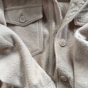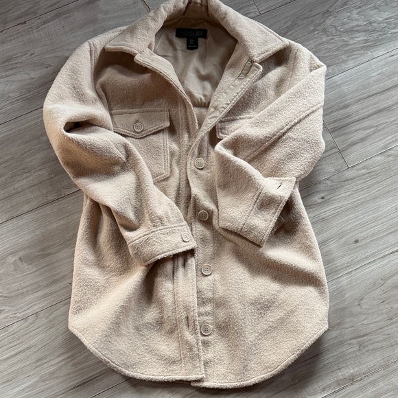 Soft cream button-down shacket by Rachel Zoe. Plush textured fabric with long sleeves. Front flap pockets and classic collar. Easy layering piece for casual looks.