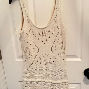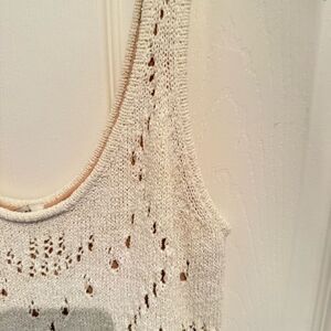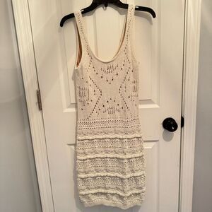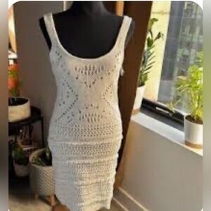 Elegant cream knit dress with intricate patterns. Sleeveless design for a chic look.