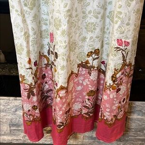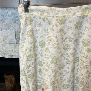 This Rachel Zoe skirt features an A-line silhouette in a midi length, perfect for casual or resort wear. The cream and light green color palette is complemented by delicate pink floral patterns, creating a soft and romantic look. Ideal for a relaxed day out, this skirt combines effortless style with a touch of elegance. Gartered back waistline