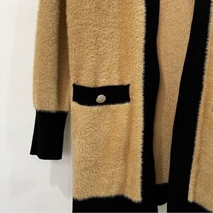 Rachel Zoe Eyelash Fuzzy Cardigan Size Small Camel Black Open Front Long Sweater