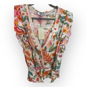 This gorgeous blouse from Rachel Zoe features a vibrant tropical floral and butterfly print in a lightweight linen-rayon blend. Designed in a flattering wrap-front silhouette with ruffled cap sleeves, tie-waist, and decorative eyelet trim, it’s perfect for dressing up or down.
