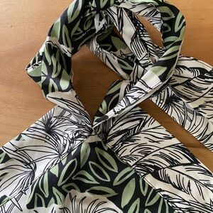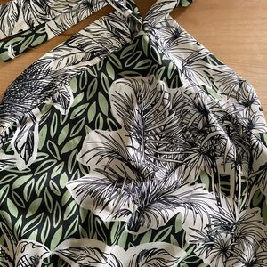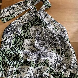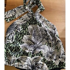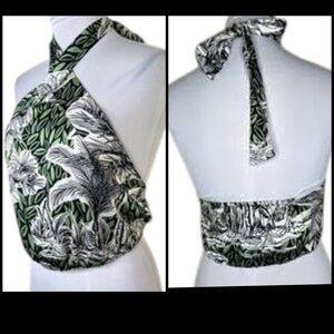 Stylish floral halter top with a tie-back design. Features a green and white pattern.