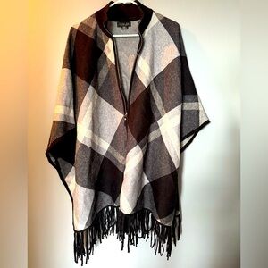 Rachel Zoe Plaid Front Zipper Fringe Cape Poncho sz 1x Black & Grey Shades