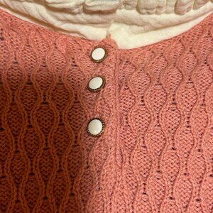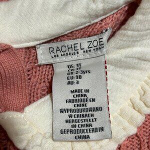 Rachel Zoe Girls Size 3T Rose Pink Long Sleeve Sweater Dress NWT, ivory ruffle peter pan collar, long sleeve with ribbed cuffs, decorative ribbon/bow at waist, ribbed hem, 3 flat ivory/gold buttons in back, not lined, 60% cotton/40% acrylic, machine wash, China.