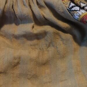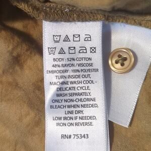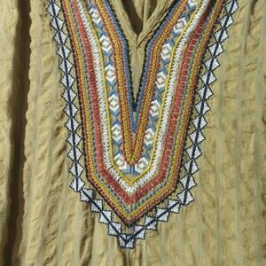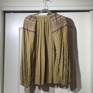 Rachel Zoe Gold Ruched Aztec Design Embroidered V Neck Top Women's Size L. Pre-owned, this top is in great condition. I love Fall colors, and this top fits the bill in every respect. The color of the fabric itself is a muted mustardy gold tone, and the embroidery complements it perfectly. I wish this top were in my size because I would not sell it. Just the right weight for those hot Fall days. Long sleeves with small button cuff. I love how the embroidery carries over to the back as well. It measures 24" long.