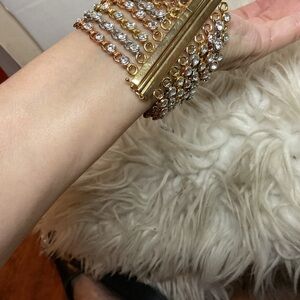 Discover the elegance of Rachel Zoe's luxurious blend of gold and silver tones. These bracelets feature sparkling crystal embellishments that catch the light beautifully, creating a statement-making layered effect.