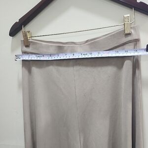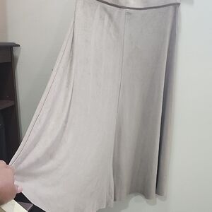 This elegant gray midi skirt by Rachel Zoe showcases a ribbed texture and a flattering A-line silhouette, ideal for both casual and work occasions. Crafted from soft, stretchy fabric, it offers comfort and style, making it a versatile wardrobe staple.