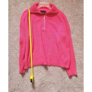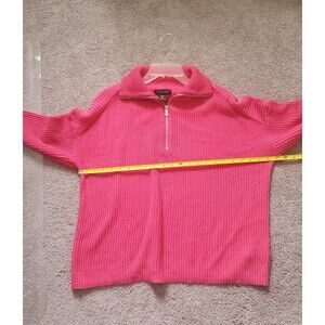 Warm sweater that will zip the neck right up for maximum warmth. Or leave the zipper down for an open relaxed look. Bright pink color and narrow ribbed cables make for a classic but fun look.