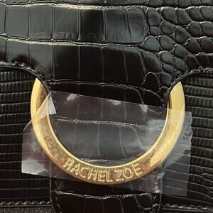 Upgrade your everyday look with this chic Rachel Zoe IRIM bag in classic black. Designed with a structured silhouette and croc-embossed flap, this versatile bag features a statement gold ring front clasp closure engraved with "Rachel Zoe," adding a touch of glam to your outfit.