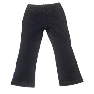 The product is a pair of Rachel Zoe jeans in women's size 12. These crop bootcut jeans feature a solid blue color with a dark wash, made from a comfortable cotton blend denim fabric. They have a high rise waist with a zip and button closure, and come with accents like branded buttons and logos. With a regular fit and 26-inch inseam, these jeans are perfect for a stylish and easy-to-care-for wardrobe staple that offers comfort and stretch for all-day
