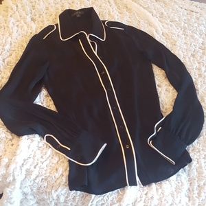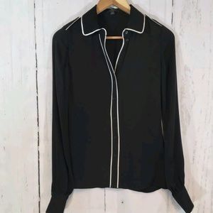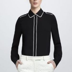 Contrast piping enhances the utilitarian appearance of a stretch silk-georgette blouse detailed with buttoned shoulder epaulets.