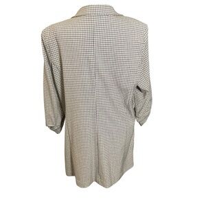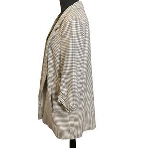 This light beige blazer by Rachel Zoe features an open-front design with wide lapels, creating a stylish draped effect. The three-quarter length sleeves and relaxed fit make it perfect for a comfortable yet chic look.