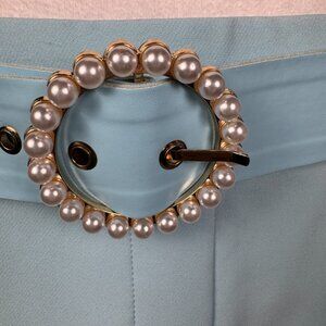 These Rachel Zoe Light Blue Women's Flat Front Wide Leg Trousers with a Pearl Belt are a size Large. The color is a beautiful baby blue, and the pearl belt adds a touch of sophistication. These are perfect for Bruch, Garden parties or Vacation/Cruise.