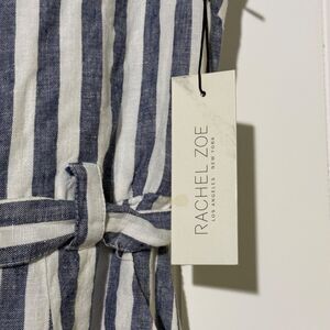 Rachel Zoe striped linen blend jumpsuit in chambray blue and white with a belted waist for a flattering fit. Designed sleeveless with a side zipper closure and wide-leg cut, this piece balances casual ease with elevated polish. The lightweight fabric makes it perfect for warm weather occasions, from daytime outings to evening gatherings. A versatile style that can be dressed up with heels and statement jewelry or worn casually with sandals for effortless chic appeal.