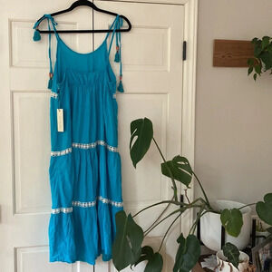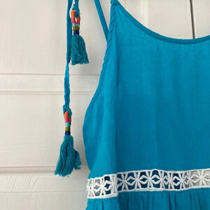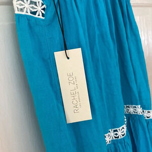 Rachel Zoe Linen Teal Bohemian Tiered Maxi Dress Crochet Pool Cruisewear Crochet