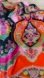 Vibrant bohemian blouse with floral patterns. Features a mix of pink, orange, and black. Flowy sleeves and relaxed fit.