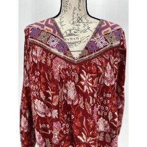Elevate your wardrobe with this stunning Rachel Zoe top. The red paisley pattern, v-neckline, and long sleeves make it perfect for any occasion whether it's for travel, party, casual or workwear. The pleated and needlepoint embroidered accents add a touch of uniqueness to this relaxed fit blouse, making it a stylish addition to your collection. Made from 100% cotton, the garment care instructions recommend hand wash. The size is regular S, perfect for women who love basic yet stylish clothing. This top is new with tags and this style was even worn on TV Home Economics. Don't miss out on the chance to own this beautiful piece! Bust pit to pit 23 Length 25 Sleeve 23