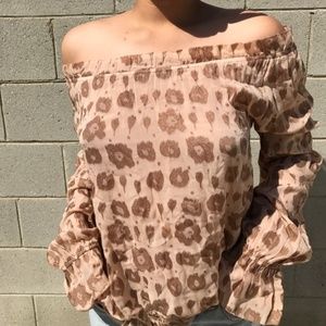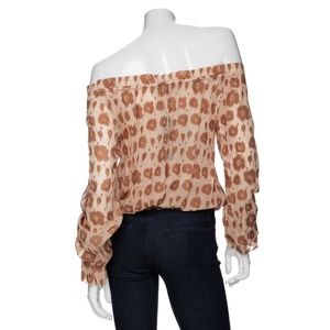 Beautiful effortlessly chick off shoulder floral blouse. Combines the feminine silhouette with the edge of a metallic-flecked print. Gathered at the neckline, cuffs and hem; the tiny ruffles above the neckline and below the cuffs and hem give it a poetic feel. Great summer/ fall transitional shirt. Relatively sheer. Fabric: 59% silk/37% polyester/4% nylon. Color nude with copper metallic. Size 4, but can fit XS-M depending if u want it baggy or tighter. Excellent condition -barely worn.