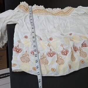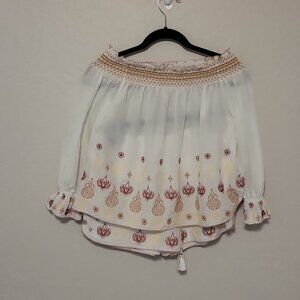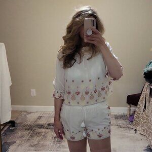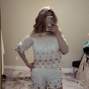 Effortlessly chic, this Rachel Zoe two-piece set features a cream and tan embroidered blouse and matching shorts. Designed to be worn on or off the shoulder, with a drawstring waist and sheer, lightweight fabric—perfect as a swim cover-up or for a stylish resort getaway.