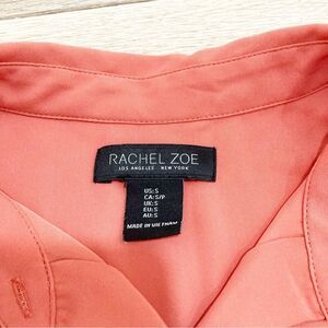 This Rachel Zoe blouse features a vibrant orange hue and a boxy silhouette, perfect for a chic and relaxed look. The notched collar and button-down style add a touch of sophistication, making it a versatile addition to your wardrobe. Ideal for casual outings, this top combines comfort with effortless style.