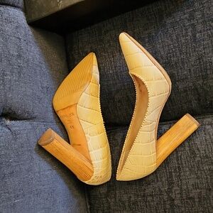 These Rachel Zoe pumps are all leather. Croc embossed leather on the outside, insole and sole is also leather. they were worn a few times and given a new outsole to prolong wear. the new sole is in perfect/new condition. cushion footed, comes with box.