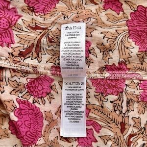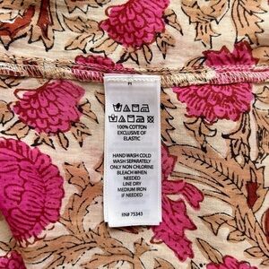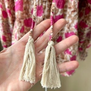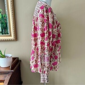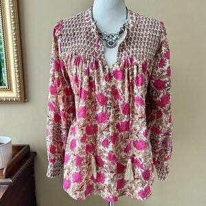 This block print floral peasant blouse in shades of hot pink and tan features a split neck with tassel trimmed tie, smocked detailing at the yoke and cuffs, long sleeves, and a fabulous boho silhouette.