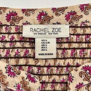 Rachel Zoe Pink Floral Boho Peasant Blouse Smocked Tie Neck Size L