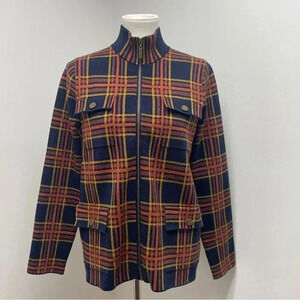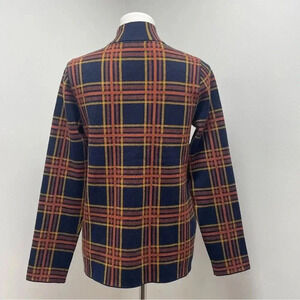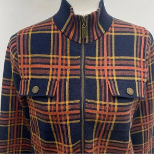 Rachel Zoe Navy Blue, Pumpkin Burnt Rust Orange, and Mustard golden yellow Plaid Full Zip Front Sweater Jacket Shacket.