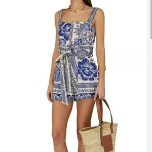 Rachel Zoe Red White Blue Linen Blend Romper Size 8 Button Down Neck Tie