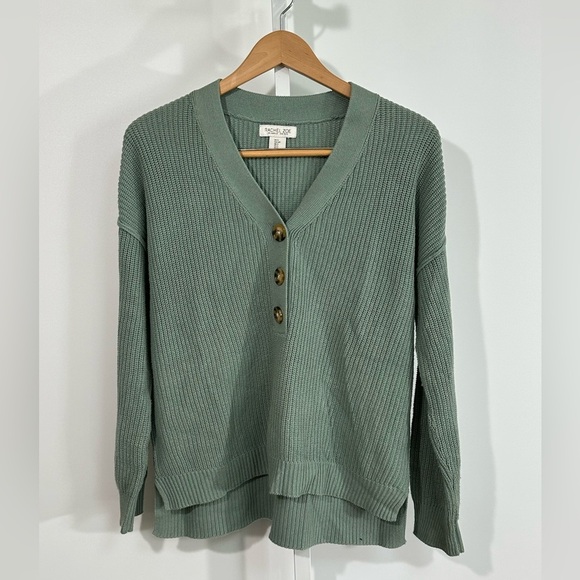 Chic and cozy Rachel Zoe sage green knit sweater featuring a deep V-neckline with a 3-button henley placket and soft ribbed texture throughout. The relaxed fit and layered split hem add subtle movement, making it an elevated essential for casual or office wear.