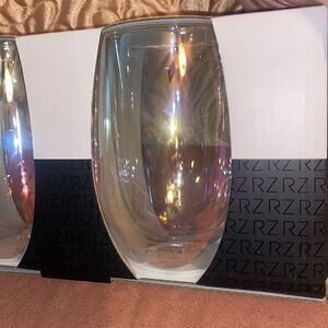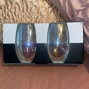 Stunning set of two Rachel Zoe double wall stemless wine glasses. This will set your evening in the perfect atmosphere. Iridescent glass picks up the light of colors. Amazing!!
