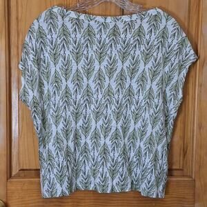 This shirt from Rachel Zoe is in excellent preowned condition - no flaws. Cream and Green Tropical Pattern. Lightweight 100% Linen. Short Cap Sleeves. Size Small.