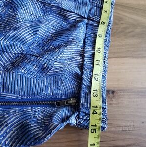 Rachel Zoe Silk Blue, White, and Black Pant. Zipper detail at pockets as well as at ankles. Faux pocket in rear.
