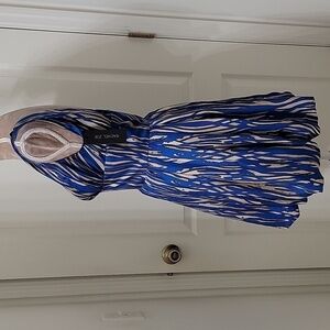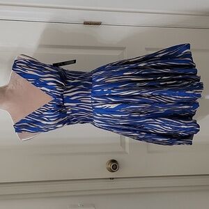 Rachel Zoe, Size 0 Cobalt Blue and Camel Abstract Striped Halter Dress 100% Silk. Gorgeous Bubble Skirted Halter Dress. NEW with Tags. Only flaw I see is a rip in the lining at the materials tag. Back Zipper Closure. Please refer to measurements in photos to ensure proper fit. This is shown on a size 6 mannequin, but could not zip (because of size).