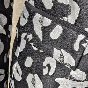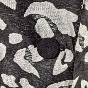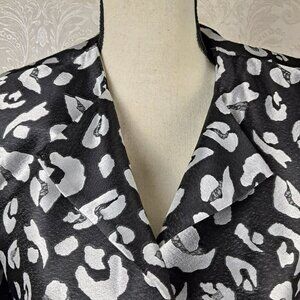 The classic animal print done in black and silver gives a new twist. One button closure on the front with a hook and thread at the bust for more coverage if desired. Faux flap pockets on the front. Back slit for ease of movement. Shoulder pads. One decorative black button at the sleeve cuff. Fully lined. Black contrast trim.