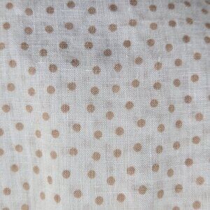 100% linen blouse has a white background and tan polka dots. Traditional collar and buttons down the front. Short sleeves have a folded cuff. Slightly longer length in the back. No pockets. Lightweight. Boxy cut.