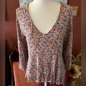 Rachel Zoe Size Medium V Neck 3/4 Flare Sleeve Babydoll Top Floral Print Hi Low