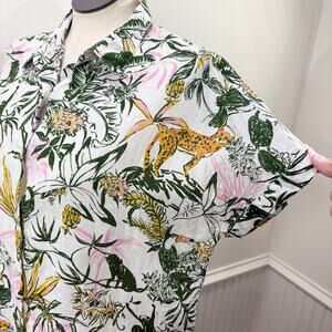 Rachel Zoe Size XL 100% Linen Top Jungle Cheetah Camp Shirt Button Up Tropical