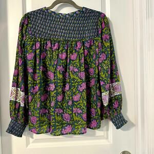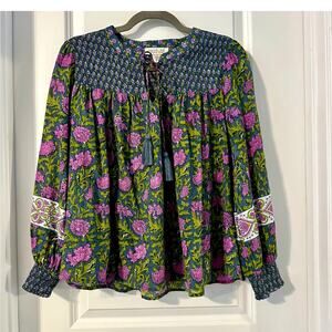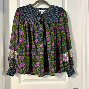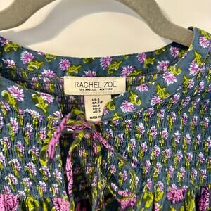 Rachel Zoe Smocked Block Print Top Women's Size S EUC features a lovely print perfect for fall. Smocking on the bodice and cuffs with a keyhole neckline with a tassle tie closure. 100% lightweight cotton. Generous fit.