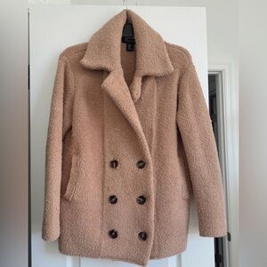 3 button, collared, long sleeve, warm jacket, pockets, oversized, tortoise buttons. Stock photo not exact jacket- just similar style.