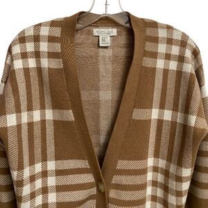 Rachel Zoe Women's Tan and White Knit Plaid Button Front Cardigan Sweater Academia Collegiate Preppy Teacher Office