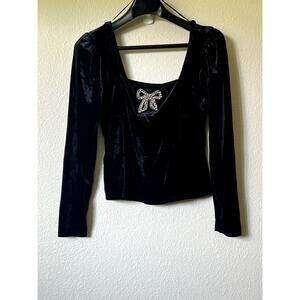 Rachel Zoe Velvet Crop Top M NWT | Black Long Sleeve Rhinestone Bow Detail