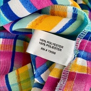 Rachel Zoe Vibrant Multi Stripe Top, Sz L. Dolman, cap sleeve top with a multi-color, horizontal stripe in sea foam green, blue, mustard, neon pink, yellow, teal, and navy blue. Cool plaid-look hem. Square neckline. 100% polyester.
