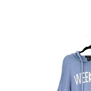 Rachel Zoe Slate Blue White WEEKEND Front Chest Hooded Drawstring Drop Shoulder Long Sleeve Side Slits Ribbed Cuffs Straight Hem Stretch Knit Sweater Cashmere Blend Pullover Hoodie Top Size Medium - Excellent condition.